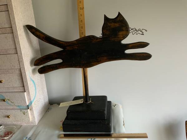 Beautiful primitive cat made from recycled and vintage wood materials measures approximately 16 1/2" tall and 18" wide. Base is 7" square.