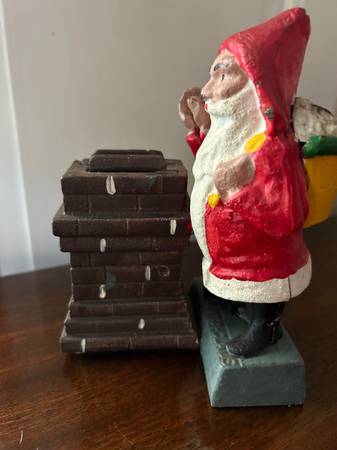 This antique coin bank features a charming design of Santa Claus by a chimney. The bank is made of cast iron and has been painted. It is an original piece and has not been modified in any way. The bank's country of origin is unknown, but it is a great addition to any collection of still banks, piggy banks, or other collectibles. The bank is in good condition and is sure to bring joy to anyone who sees it. There is one small chip on the lower back of the bank (see photo), and some obvious wear, it being antique.
