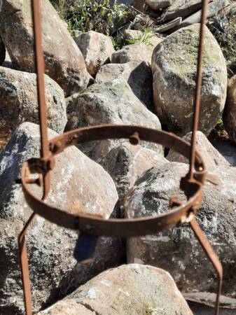 Aladdin model 9 - 11 hanging frame for Aladdin hanging lamp font. This frame is as found. It used to be nickle, it's now rust. It needs to be sand blasted and painted with high temp paint. It does not have it's smoke deflector, necessary if using with a kerosene lamp, but not if using with a electrified font. It has clips and screws to hold a glass Aladdin hanging lamp shade or arms can be found to hold a paper Aladdin shade.