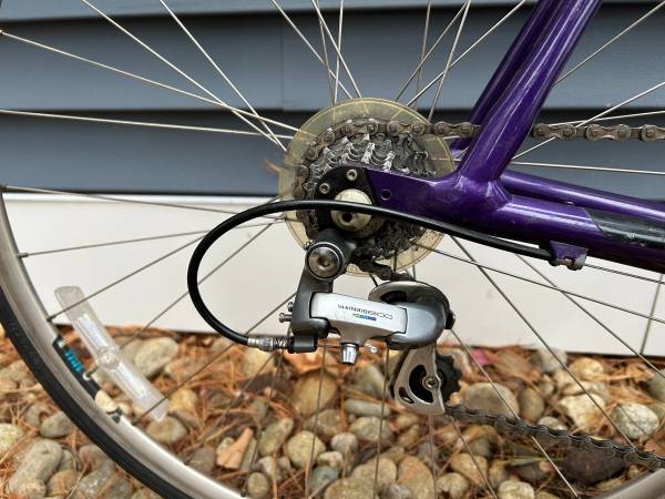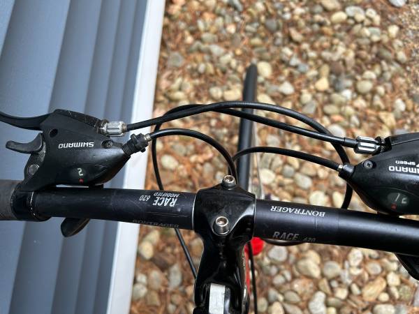 Shimano 105 components. This was a supr fast racing bike with those aero handlebars. It has been converted using a Bontrager Flat-bar handlebars and has Shimano Shifters. Ready to ride.