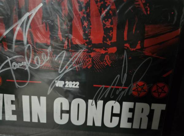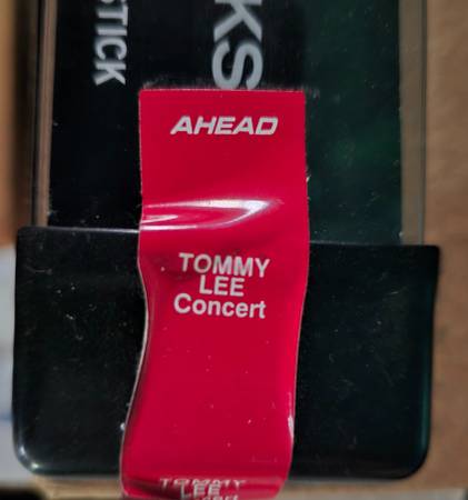 Poster signed by 4 from the Stadium tour at Fenway park. With a sealed pair of Tommy Lee concert drum sticks