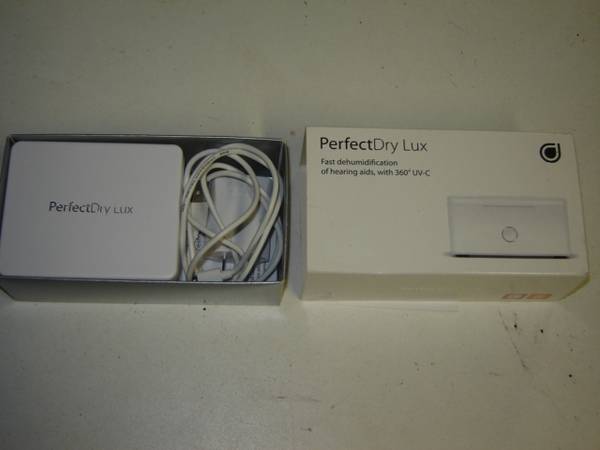 Perfect Dry Lux hearing aid drier. NEW_ Complete in box, with charger and instructions. Use for hearing aids, EarPods, earbuds. . $25. E-mail, or call