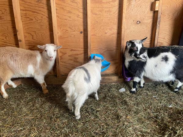 Free Nigerian Dwarf goats. All three are does. Must go to a good home, and as a full heard of three. Biological mother approximately 6/7 years old and 2 goat kids born on 3/19/25. Very well adjusted and friendly, especially the little white one, who will follow you every where you go if you would like her to!