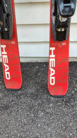 Head Mojo 65 Downhill Skis 127cm with Fischer Bindings Red White. Excellent pair of youth skis. They're in great shape and work well. Pick up in Dover, NH also have poles, boots, helmets, goggles